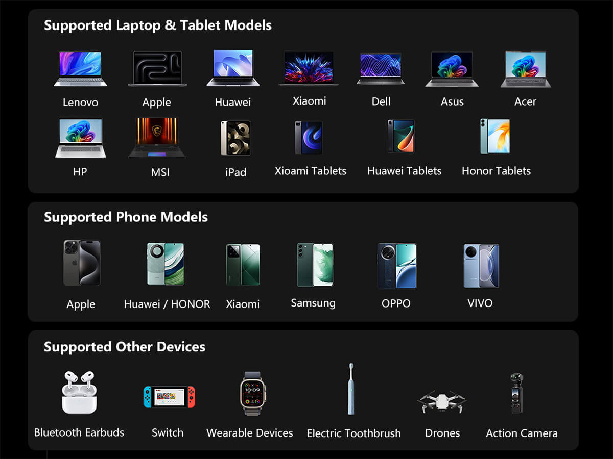 Diseñada para usuarios exigentes, esta batería externa de 20.000mAh ofrece potencia real de hasta 100W, compatible con PD 3.0 y múltiples protocolos de carga rápida para una amplia compatibilidad. Proporciona una carga estable, rápida y eficiente para portátiles, tablets y smartphones, ideal para el trabajo, los viajes y el uso diario.